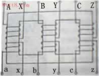 在三相變壓器中,每一芯柱均繞有原繞組和副繞組,相當(dāng)于一只單相變壓器.三相變壓器高壓繞組的始端常用A,B,C,末端用X,Y,Z來表示.低壓繞組則用a,b,c和x,y,z來表示.高低壓繞組分別