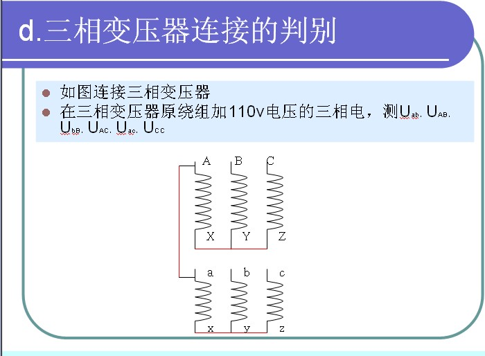 在某相原繞組施加110v電壓,測定三個付繞組中感應(yīng)電勢,感應(yīng)電勢最大的一組付繞組就是該項繞組的付繞組。