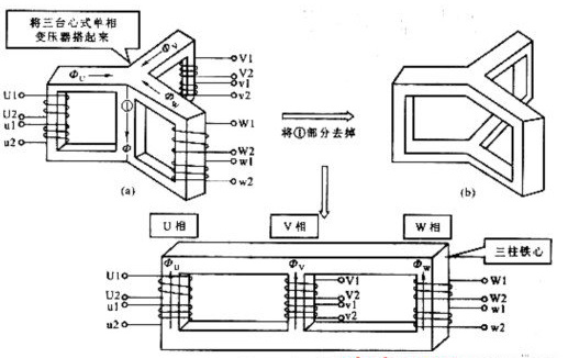 三相變壓器的另一種結構型式是把三個單相變壓器合成一個三鐵心柱的結構型式,稱為三相心式變壓器。